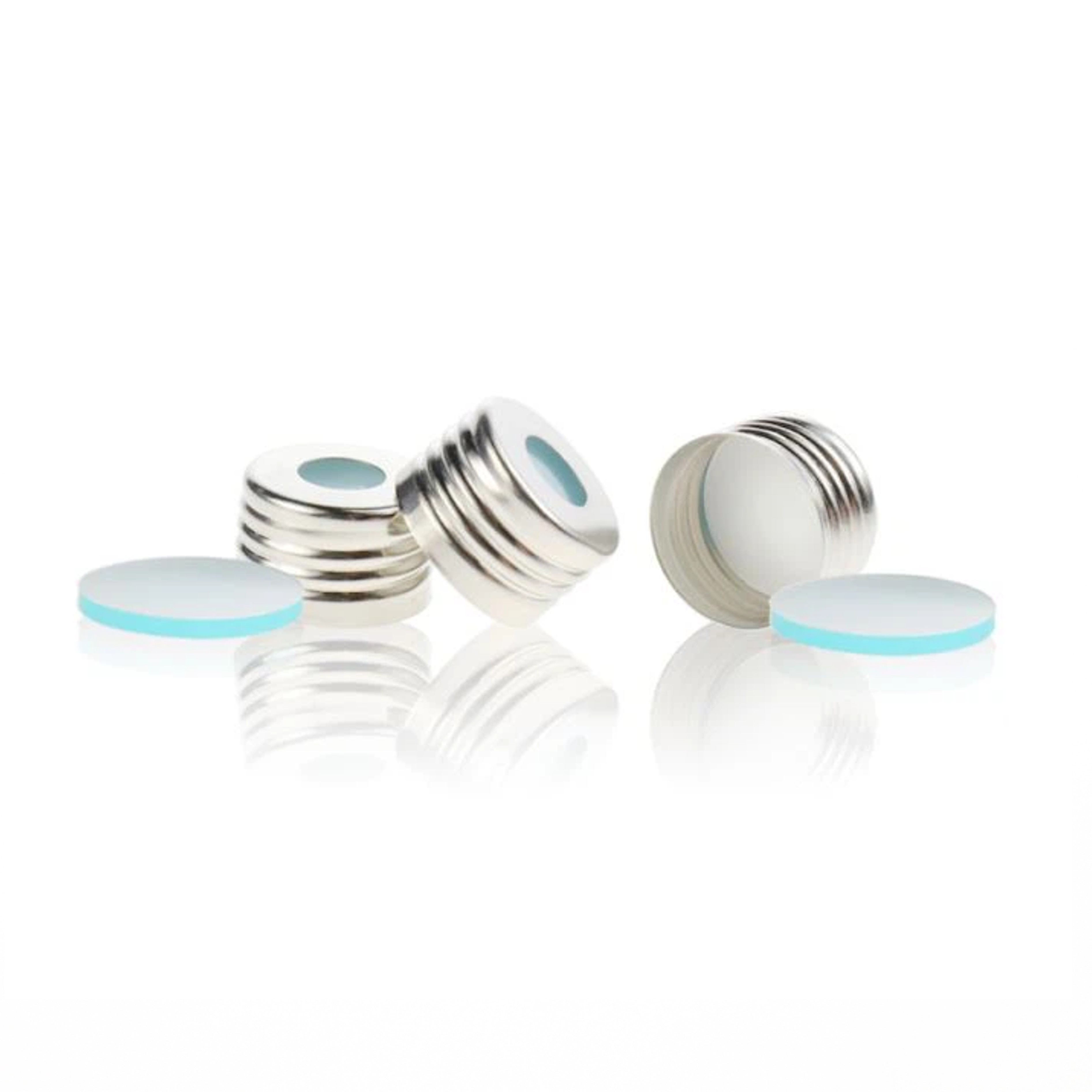 18 mm silberfarbene, offene Metallkappe (8 mm Öffnung) mit 17,5 mm ⌀ naturfarbenem PTFE/blauem, transparentem Silikonseptum, 1,5 mm dick (UltraClean). 100 Stück/Packung, 5,00 Packungen/Karton
