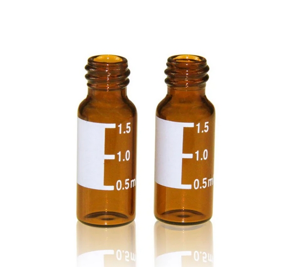 2-ml-Fläschchen aus Braunglas, 12 x 32 mm, flacher Boden, 8-425-Schraubgewinde, mit Etikett. 100 Stück/Packung, 15,00 Packungen/Karton
