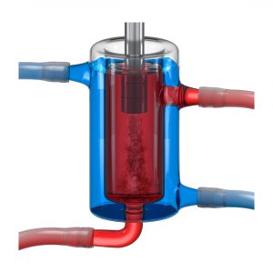 Durchflussgefäß DG mit Kühlmantel. Zur kontinuierlichen Beschallung größerer Mengen im Durchfluss. Der Kühlmantel gestattet eine Temperierung durch flüssige Kühlmittel während der Beschallung über vorhandene Schlauchanschlüsse.