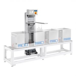 Die Hubeinrichtung ist eine Arbeitserleichterung für den Bediener. Sie ermöglicht das automatische Oszillieren in den Reinigungs- oder Spülbad und erleichtert den Transport der befüllten Warenkörbe von Wanne zu Wanne. Durch die langsam oszillierende Auf- und Abwärtsbewegung wird die Reinigungswirkung des Ultraschalls verstärkt und die angelöste Verschmutzung besser abgespült.