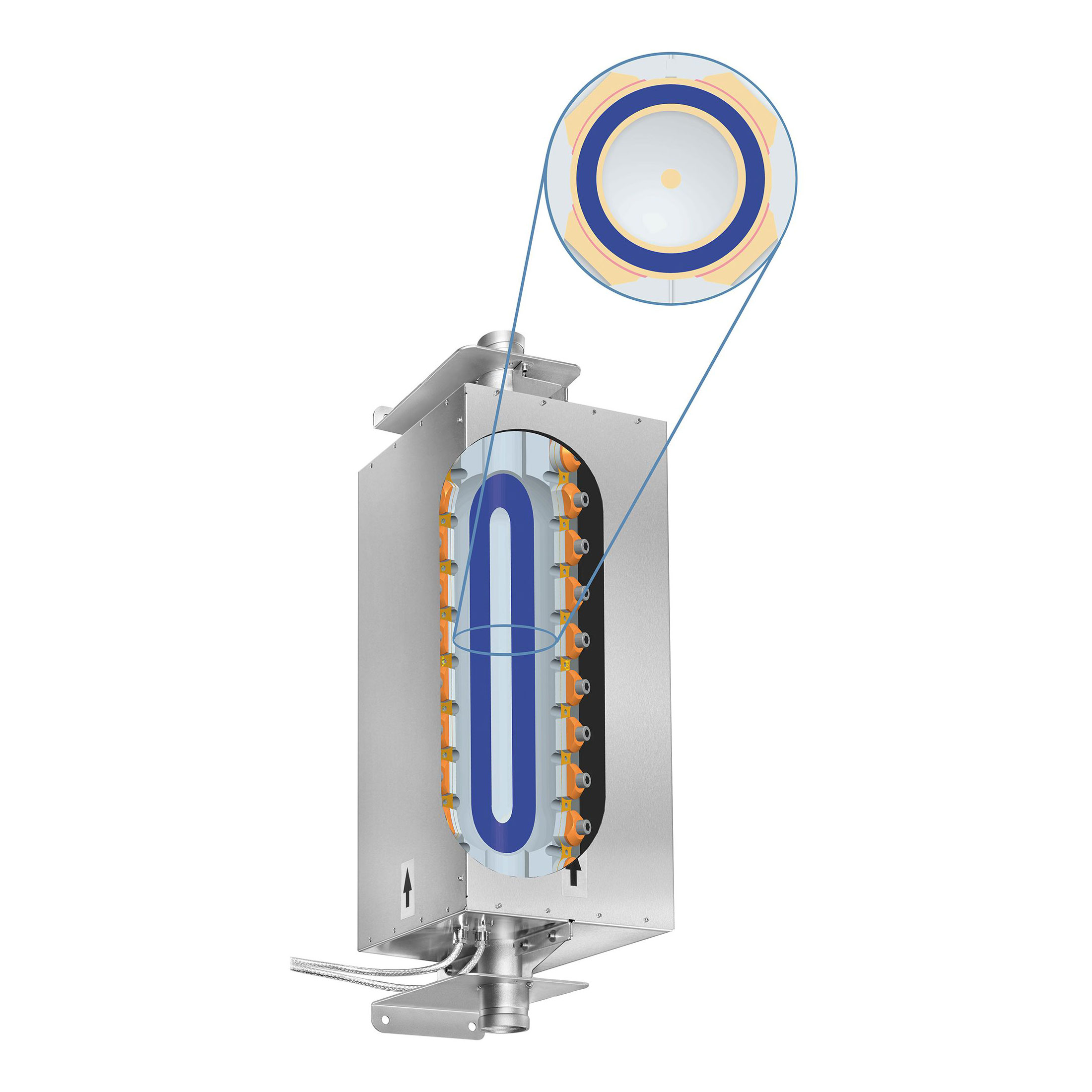 Die definierte Stromführung des zu beschallenden flüssigen Mediums durch einen Doppelspalt im BANDELIN-Wirbelreaktor garantiert eine homogene Beschallung an der besonders kavitationsintensiven Innenfläche des Reaktorrohres und in dem intensiven Schallfeld im Bereich des Doppelspaltes. Eine zusätzliche Verwirbelung des zu beschallenden Mediums beim Eintritt in das Reaktorrohr verbessert die Homogenisierung zusätzlich.