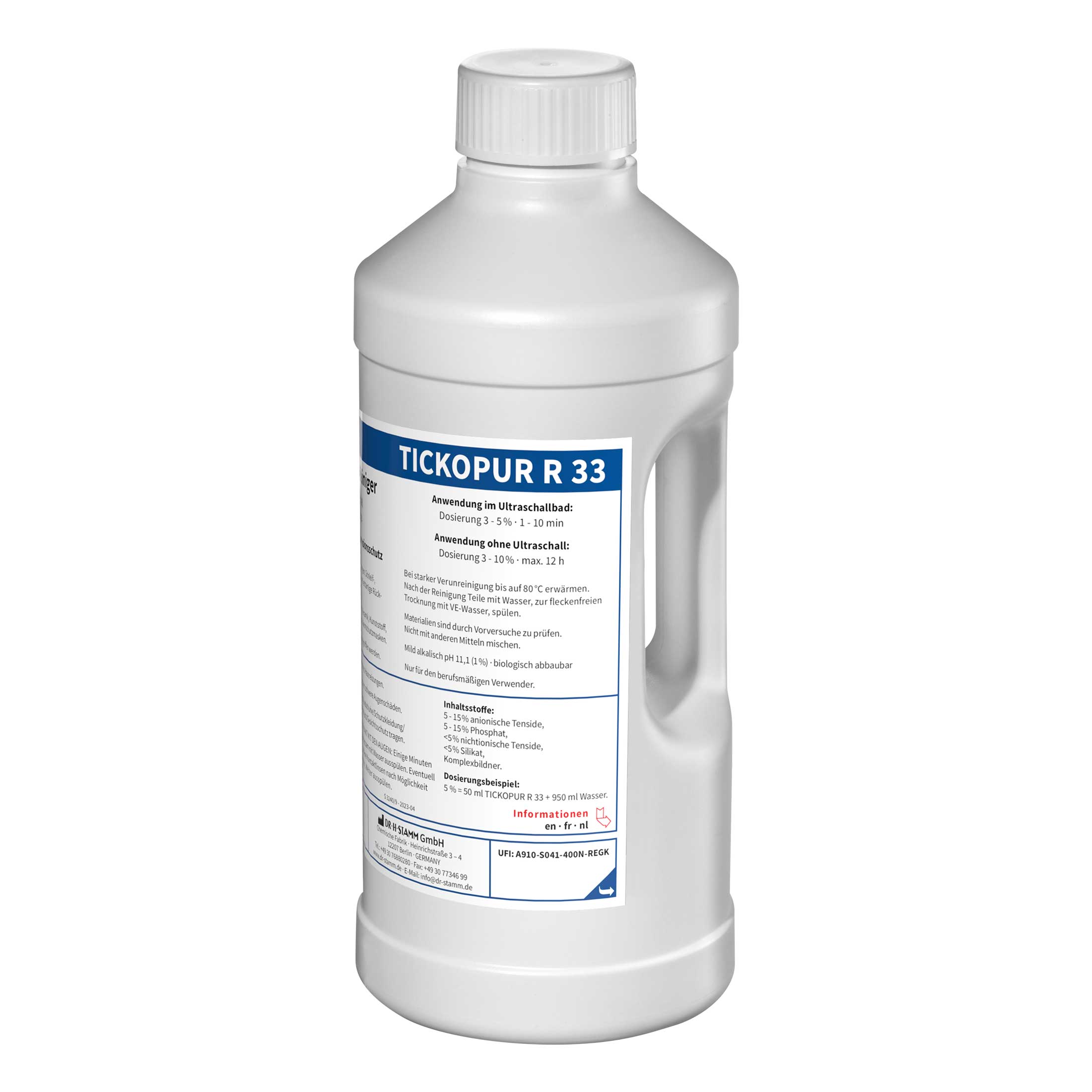 TICKOPUR R 33 ist speziell für die Reinigung in SONOREX-Ultraschallgeräten, aber auch zur Tauch-, Wisch und Hochdruckreinigung einzusetzen. Bei sachgemäßer Anwendung wird eine schnelle und materialschonende Reinigung gewährleistet.