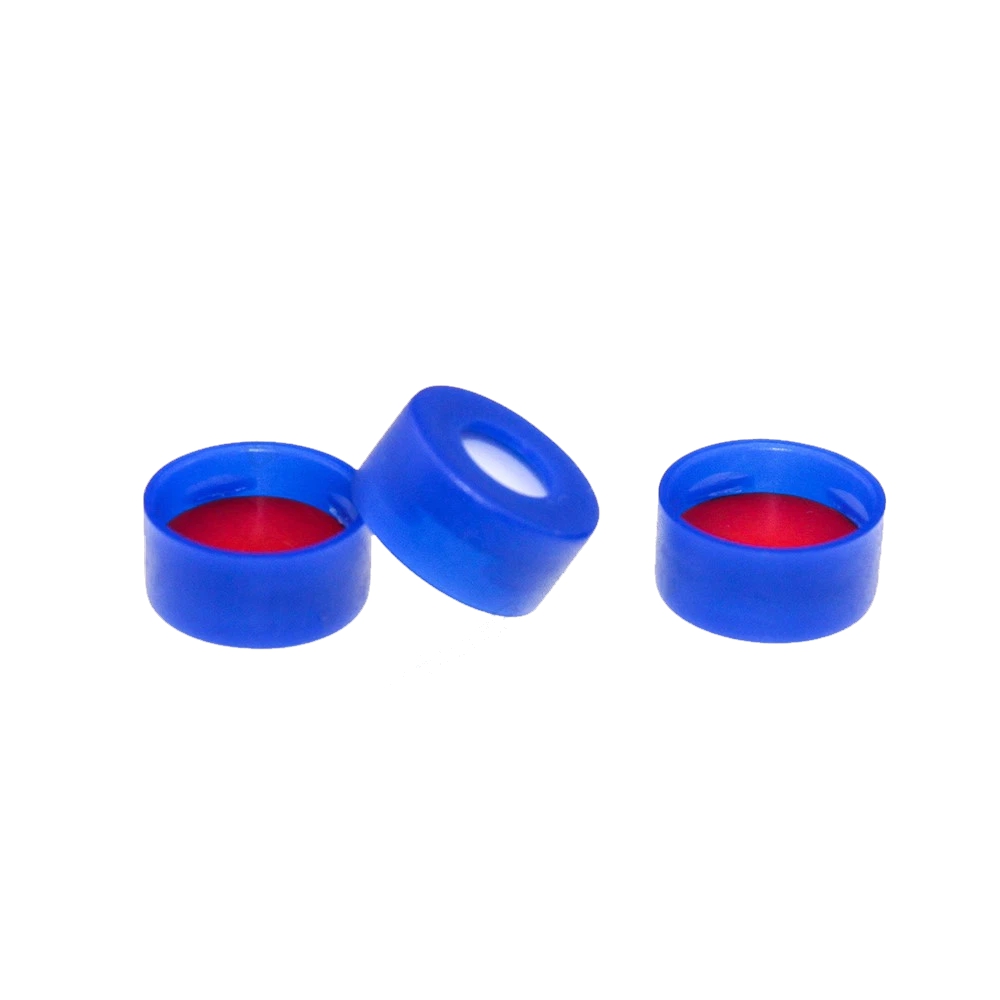 Blauer 11-mm-Schnappverschluss mit offenem Deckel und rotem PTFE-/weißem Silikonseptum (1 mm dick). 100 Stück/Packung, 20,00 Packungen/Karton