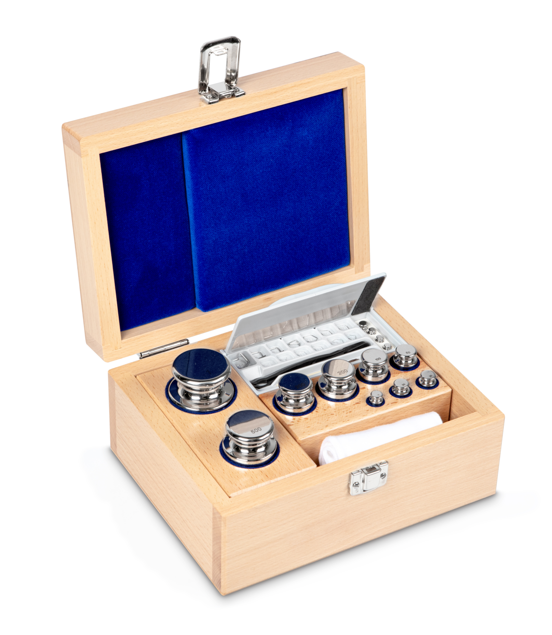 Gewichtsatz 303-06 (OIML-Klasse E1, Nennwert 1 mg – 1 kg, Knopf, Edelstahl poliert, im Holzetui)