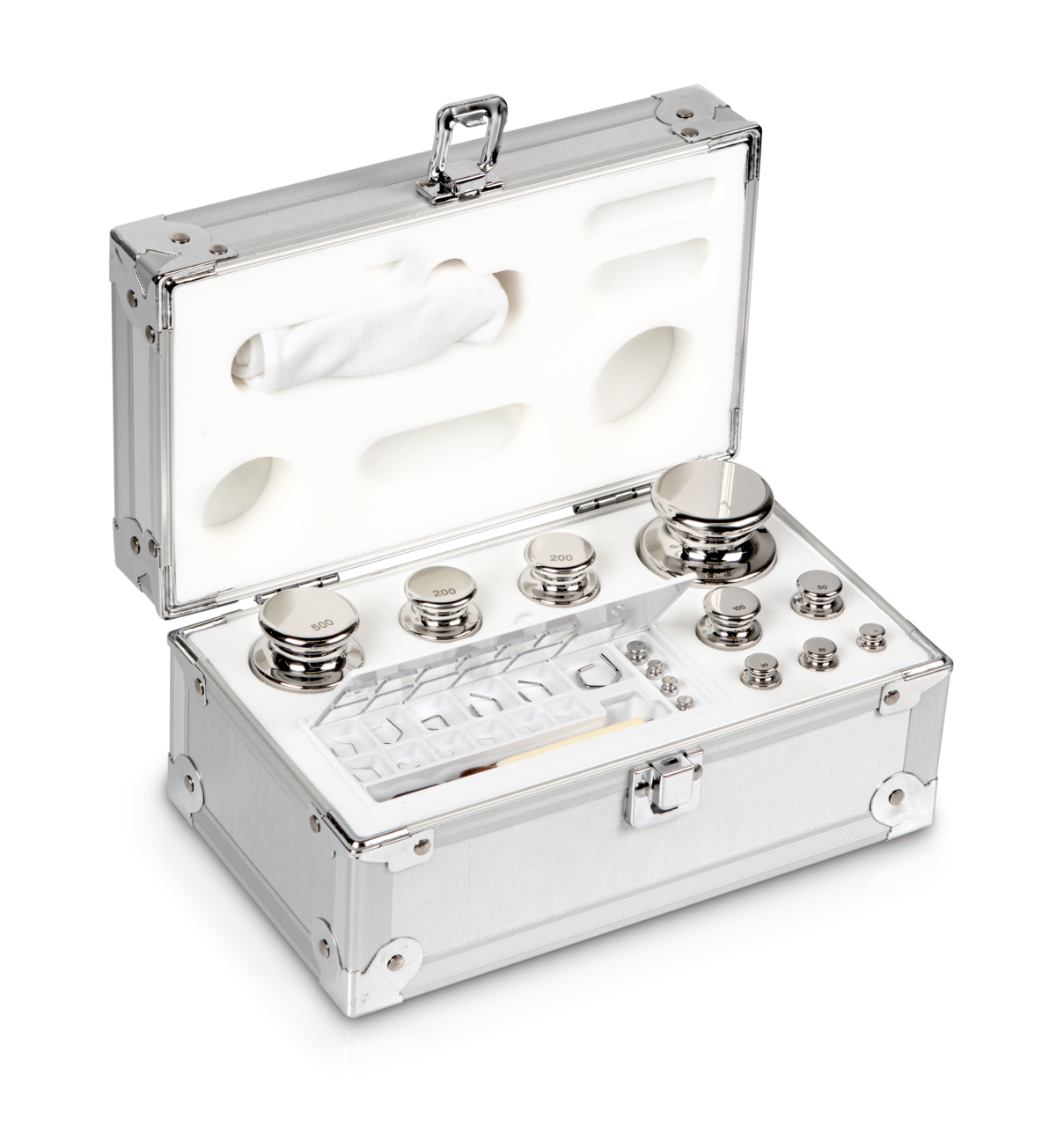 Gewichtsatz 303-066 (OIML-Klasse E1, Nennwert 1 mg – 1 kg, Knopf, Edelstahl poliert, im Aluminiumetui)