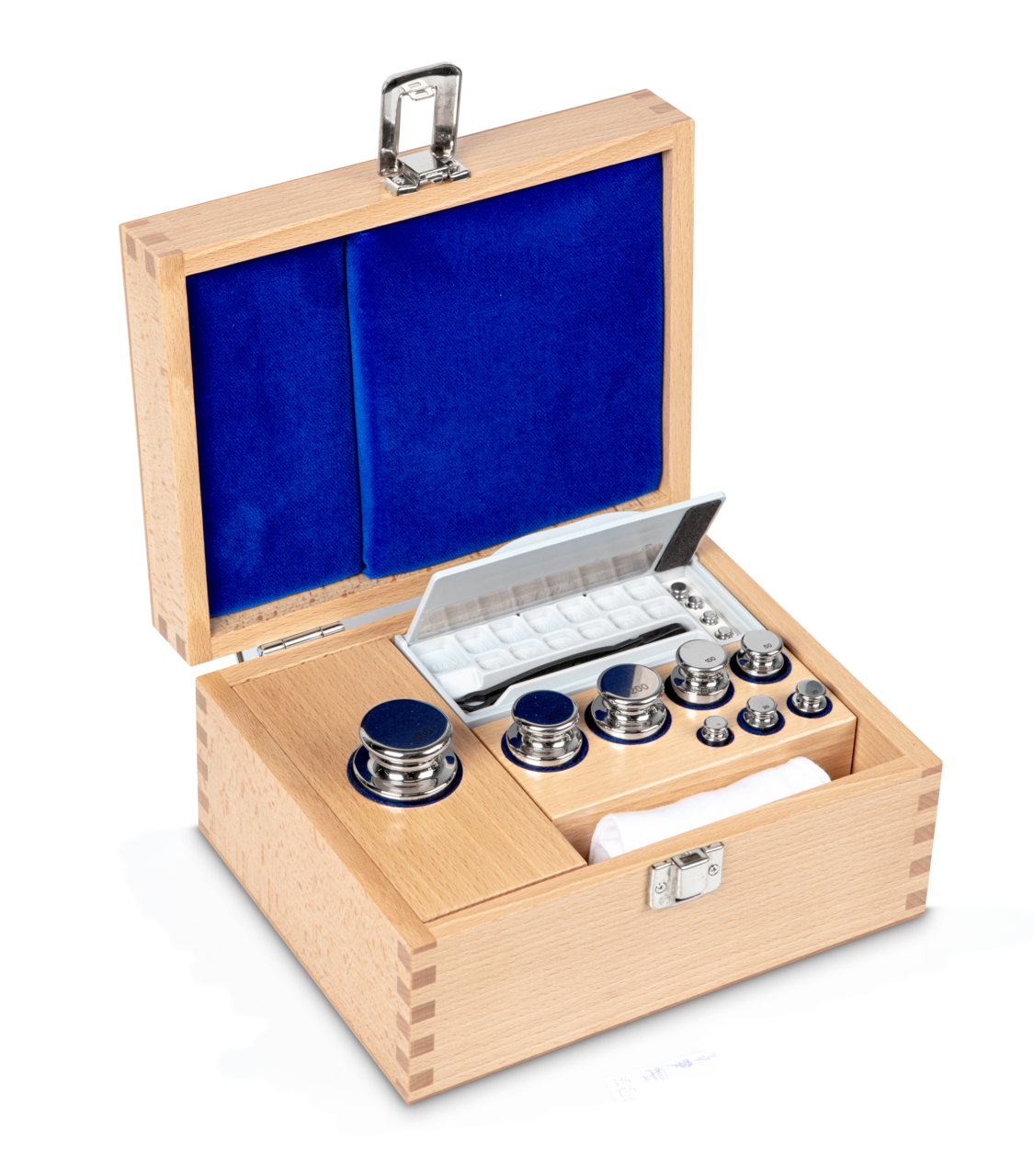 Gewichtsatz 304-05 (OIML-Klasse E1, Nennwert 1 g – 500 g, Knopf, Edelstahl poliert, im Holzetui)