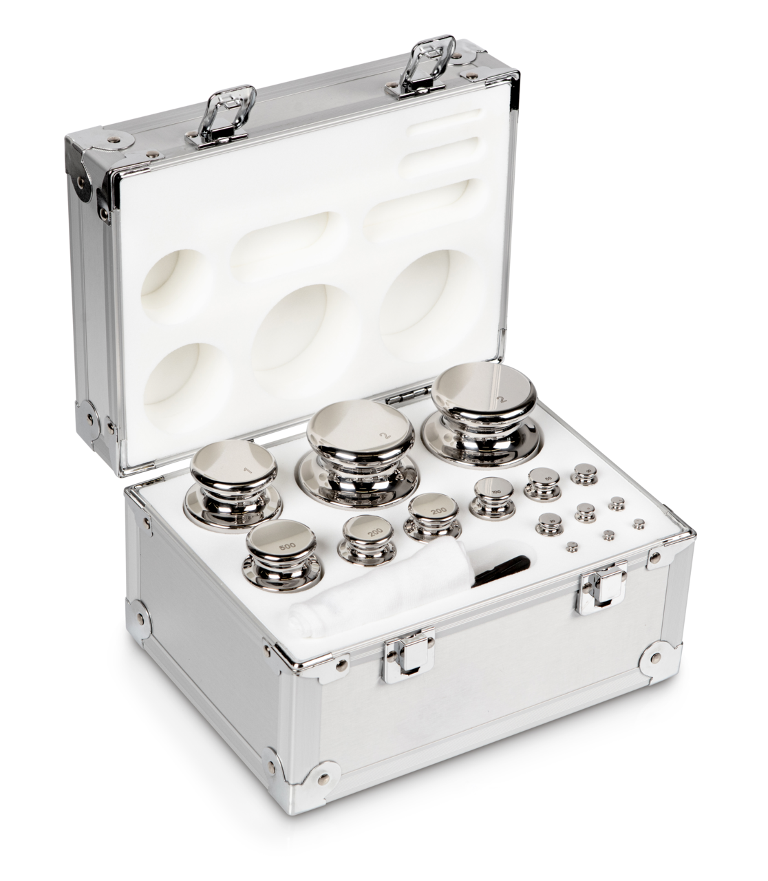 Gewichtsatz 304-076 (OIML-Klasse E1, Nennwert 1 g – 2 kg, Knopf, Edelstahl poliert, im Aluminiumetui)