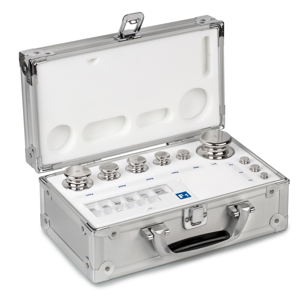 F1 1 mg – 500 g Gewichtsatz im Aluminiumetui, Edelstahl poliert