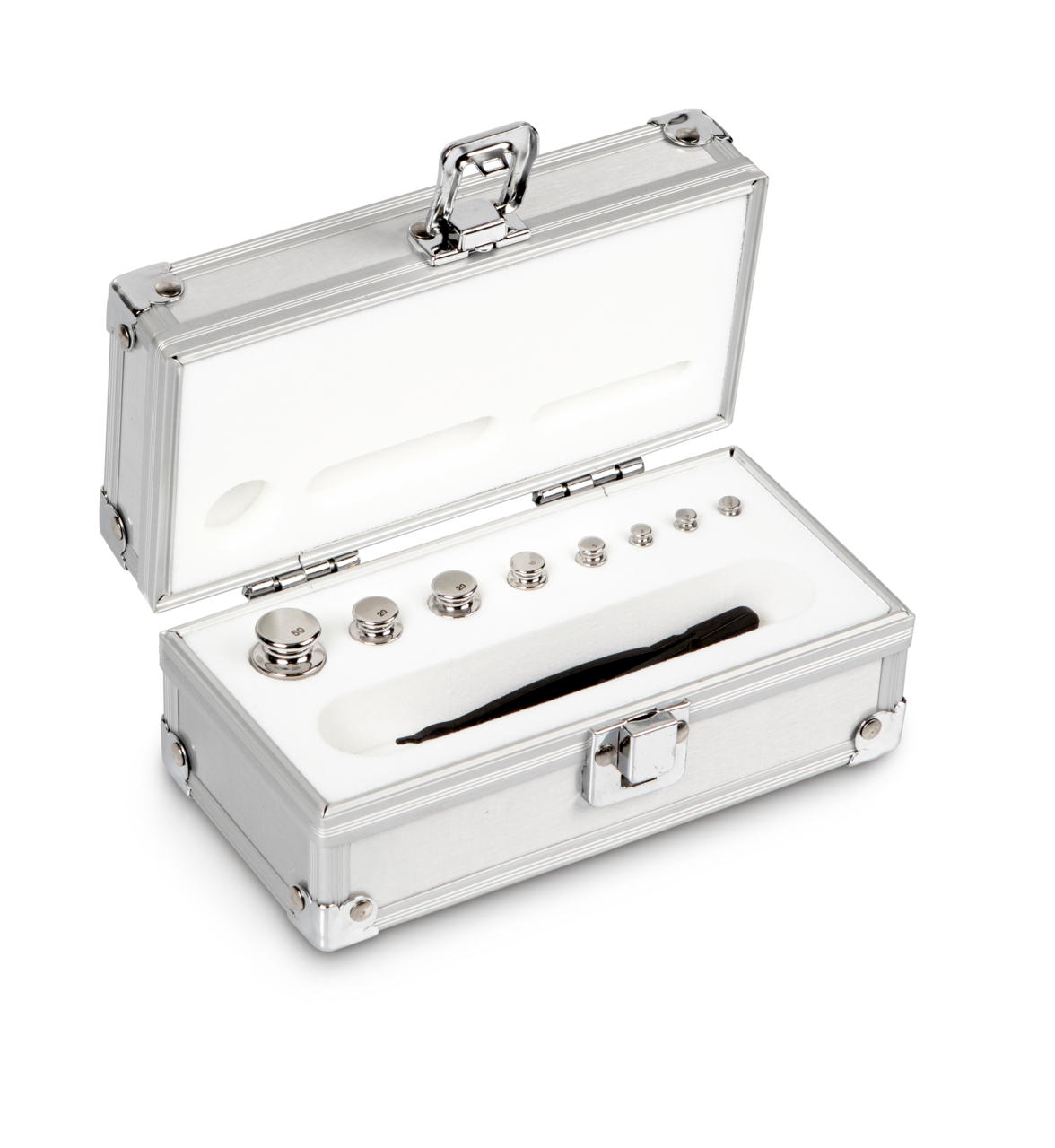Gewichtssatz, F1, 1 g – 50 g, Knopf, Edelstahl poliert, im Aluminiumetui