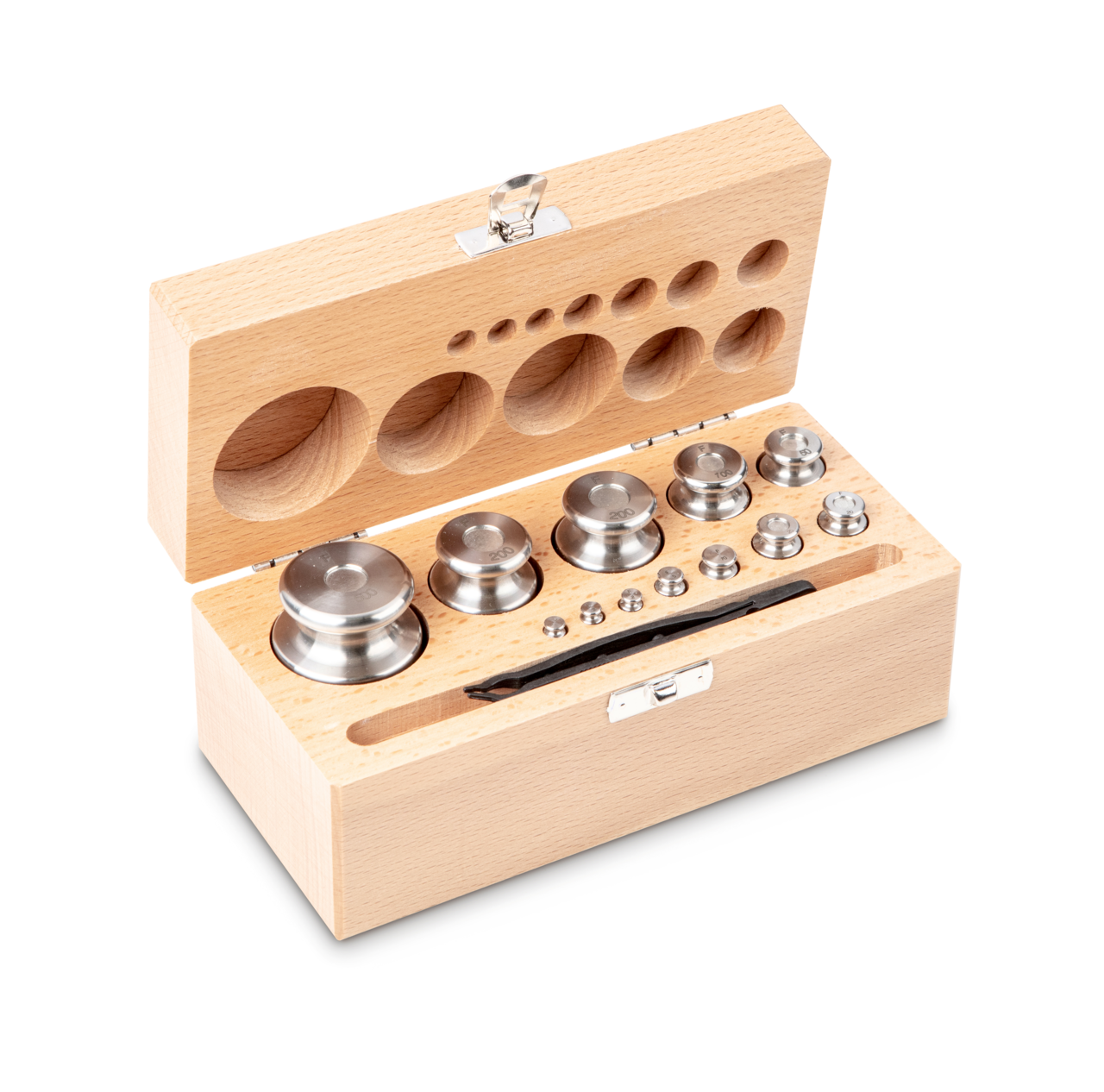 F2 1 g – 500 g Gewichtsatz im Holzetui, Edelstahl feingedreht