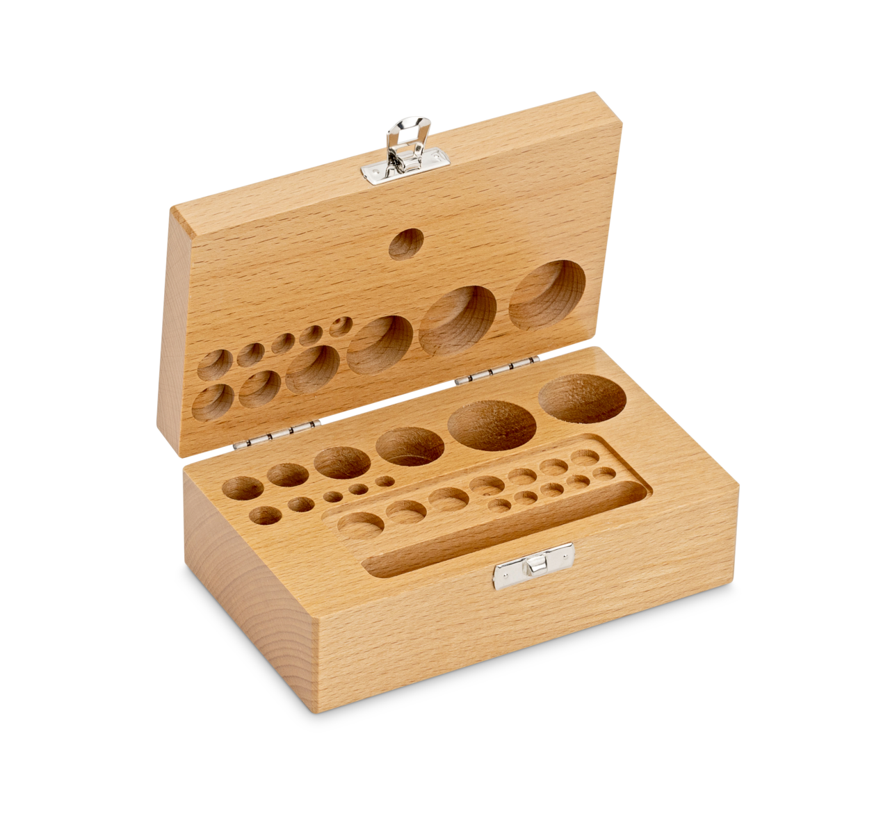 Holz-Gewichtsetui, 1 mg – 200 g Buche für F2 + M1 + M2, Knopf/Kompakt
