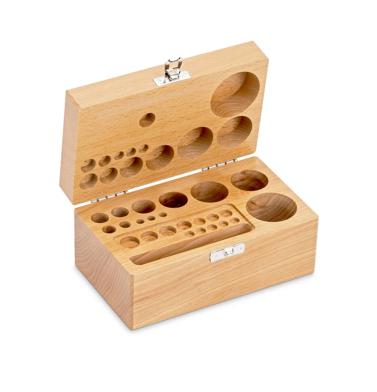 Holz-Gewichtsetui, 1 mg – 500 g Buche für F2 + M1 + M2, Knopf/Kompakt