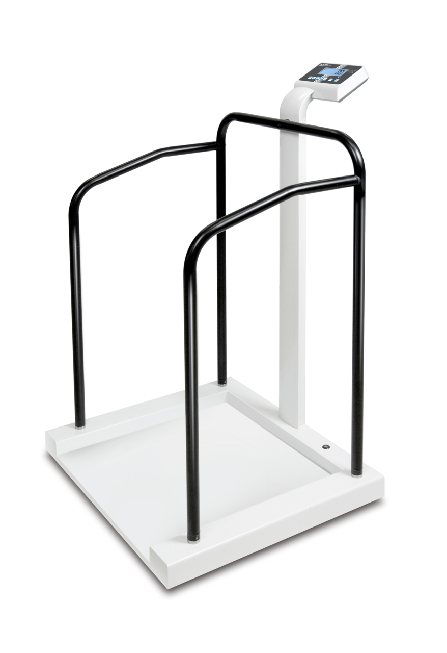- Die stabile Haltekonstruktion ermöglicht gebrechlichen und schwachen Patienten gleichzeitig sicheres Stehen und präzise Gewichtsbestimmung