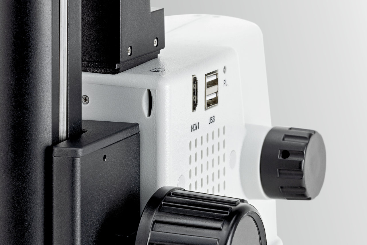 - Das Videomikroskop verfügt über eine HDMI- und zwei USB 2.0-Schnittstellen sowie einen Micro-SD-Kartenslot