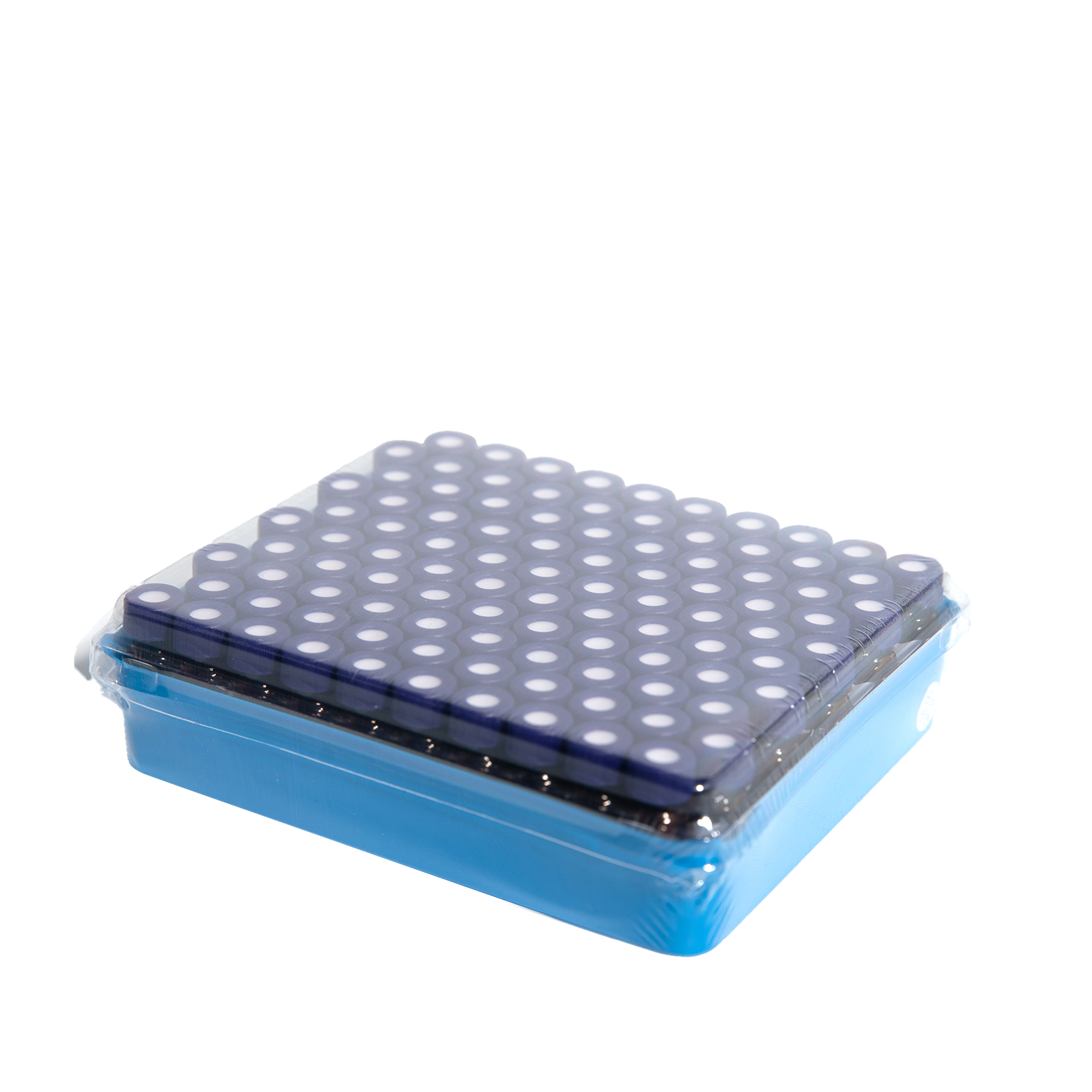 Blauer, gerippter 9-425-Schraubverschluss mit offenem Deckel und ⌀ 9mm, rotem PTFE-/weißem Silikonseptum (1 mm dick, UltraClean). Die Septen sind vormontiert.