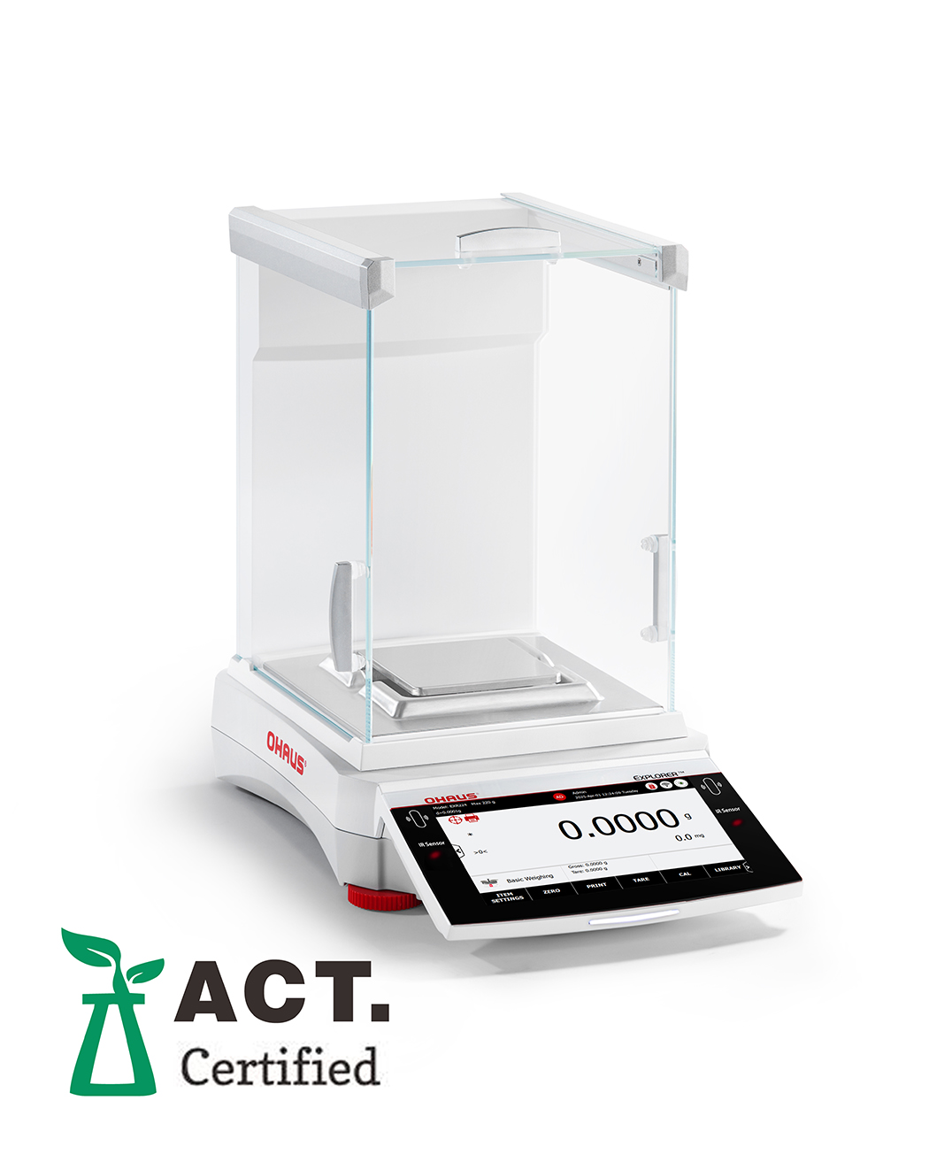 Metallgehäuse, Wägeschale aus Edelstahl 316, antistatischer Windschutz aus Glas, 2 berührungslose Sensoren, Statusleuchten am Terminal
