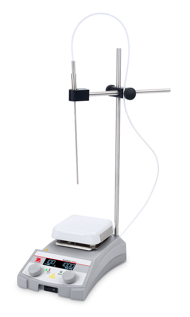 OHAUS Guardian™ 3000-Heizrührer sind für Erhitzen und Rühren in allen Laborumgebungen ausgelegt. Das helle LCD-Display enthält leicht ablesbare Temperatur- und Geschwindigkeitseinstellungen, intuitive Symbole und eine auffällige Anzeige für heiße Oberfläche, die aufleuchtet, wenn die Heizplatte über 40 °C warm ist. Wählen Sie aus drei Plattengrößen für Ihre spezifische Anwendung. Alle Modelle können mit dem optionalen Temperaturfühler zur präzisen Temperatursteuerung der Probe verwendet werden.