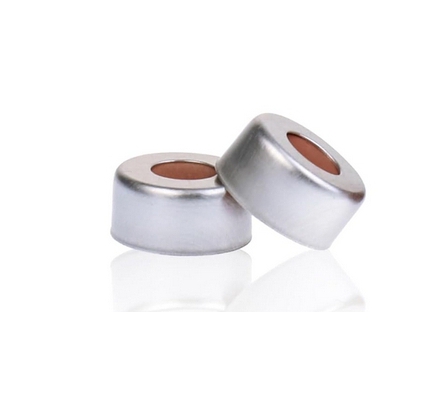 Silberne 11-mm-Crimpkappe mit offenem Oberteil und 1 mm dickem Septum aus rotem PTFE, weißem Silikon und rotem PTFE. 100 Stück/Packung, 20,00 Packungen/Karton