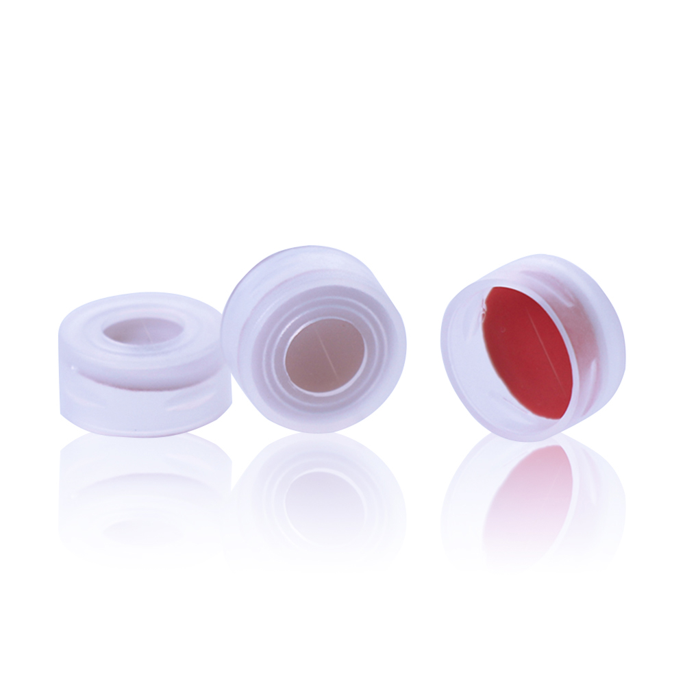 Transparente 11-mm-Schnappkappe mit offenem Deckel, rotem PTFE-/weißem Silikonseptum (1 mm dick, vorgeschlitzt). 100 Stück/Packung, 20,00 Packungen/Karton