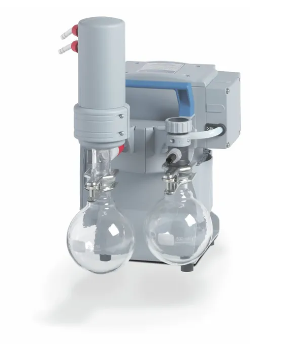 Dieses Chemie-Vakuumsystem findet ein breites Anwendungsgebiet zum Evakuieren, Eindampfen und Abpumpen von Gasen und Dämpfen in chemischen, biologischen und pharmazeutischen Laboren. Typische Anwendungen sind Rotationsverdampfer, Vakuumkonzentratoren und Vakuumtrockenschränke. Der saugseitige Abscheider (AK) aus Glas mit Schutzbeschichtung hält Partikel und Flüssigkeitströpfchen zurück. Der druckseitige Emissionskondensator (EK) ist besonders wirksam und kompakt. Er ermöglicht die nahezu hundertprozentige Rückgewinnung von Lösemitteln, deren wirtschaftliche Wiederverwendung und aktiven Schutz der Umwelt ohne externes Kühlmittel.