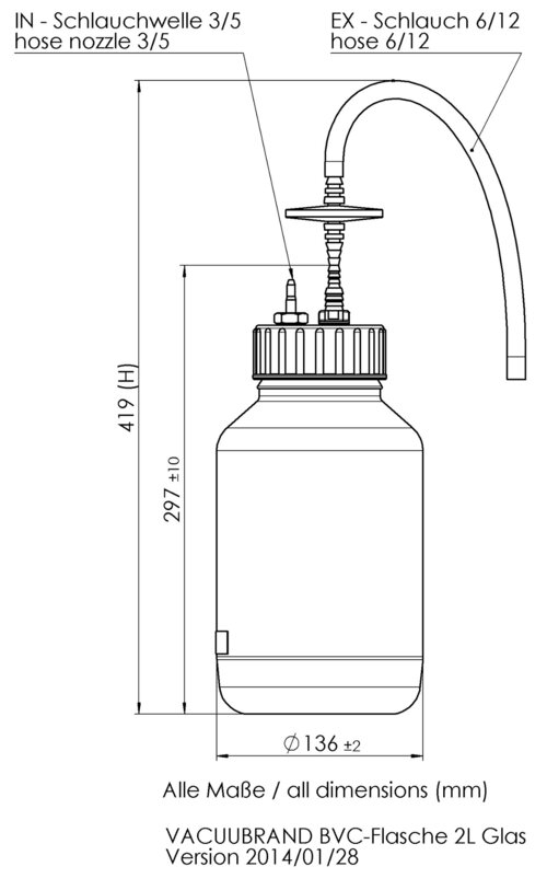 2l-Auffangflasche aus Borosilikat-Glas mit sehr hoher Chemikalienbeständigkeit, Kunststoffbeschichtung (außen) als Splitterschutz und zum Minimieren des Flüssigkeitsverlustes bei Glasbruch, spezieller Verteilerkopf für minimierte Aerosol- und Schaumbildung, Schlauchwelle zum Anschluss eines VacuuHandControl VHCpro, Anschlussmöglichkeit für zweiten VHCpro (Option), Filterelement 0.2 µm mit hydrophober Membrane zum Schutz von Pumpe, Leitungen und Umgebung, Schlauch zum Anschluss an Pumpeinheit BVC oder BVC basic, komplett autoklavierbar.