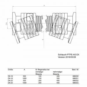 Schlauch nur außen gerippt, innen nahezu glattwandig, aus antistatischem PTFE mit ausgezeichneter chemischer Beständigkeit, mit KF Flanschen (Edelstahl). Ableitfähigkeit gemäß BS 5958:1991 / EN ISO 8031 mit < 10^7 Ohm Widerstand zwischen Innenseite und Flanschen.