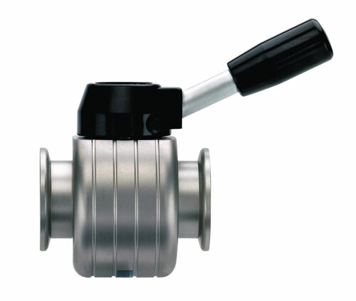 Edelstahl, KF DN 25 Ventile der Reihe VS und VS C sind Durchgangsventile in Schmetterlingsbauart. Eine runde Ventilplatte mit außenliegendem Dichtring dreht sich um eine quer zum Ventilgehäuse verlaufende Achse. Dadurch geben die Ventile nahezu den ganzen Querschnitt frei und weisen sehr gute Leitwerte auf. Die Ventilgehäuse sind in einem Stück aus Vollmaterial gearbeitet und benötigen außer der Ventiltellerdichtung nur eine einzige elastische Wellendichtung, die nur auf Drehung beansprucht wird. Diese Ventile weisen sehr niedrige Leckraten und eine geringe Gasabgabe auf. Bei der C-Ausführung besteht die Ventiltellerdichtung aus chemisch beständigem Perfluorelastomer.