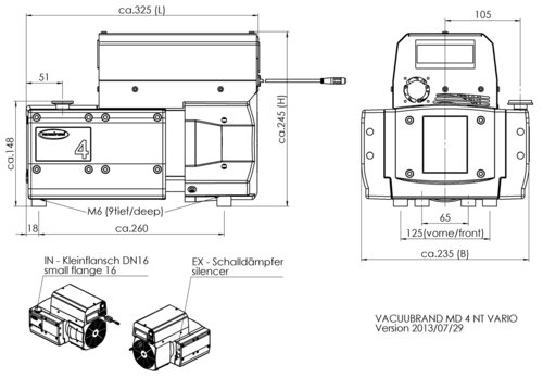 Dreistufige Membranpumpen sind ideal für kontinuierliches, ölfreies Pumpen von Gasen und erreichen ein sehr gutes Endvakuum. Durch die verwendeten Materialien wie Aluminium und ausgewählte Kunststoffe eröffnet sich ein breites Anwendungsfeld bei nicht-aggressiven Gasen. Die MD 4 VARIO select bietet einen besonders leisen und vibrationsarmen Betrieb, hohe Gasdichtigkeit und verbesserte Leistungsdaten. Durch die hochflexiblen FKM-Doppelmembranen mit Gewebeverstärkung wird eine sehr lange Membranlebensdauer erreicht. Die VARIO-Ausführung regelt das Vakuum punktgenau über die Drehzahl und besteht aus der Pumpe und dem Vakuum-Controller VACUU·SELECT mit externem Druckaufnehmer. Durch den bedarfsgerechten Betrieb erhöht sich die Lebensdauer der Membranen nochmals erheblich. Dreistufige Membranpumpen sind ideal zum kontinuierlichen, ölfreien Evakuieren und Abpumpen nicht-aggressiver Gase bei hohen Vakuumanforderungen wie in der Physik und Analytik. Dank ihres hohen Saugvermögens und sehr guten Endvakuums können diese Pumpen häufig Drehschieberpumpen ersetzen. Typische Anwendungen sind die Abgasanalytik, die Entgasung von zähflüssigen Medien und insbesondere als Vorpumpe für Turbomolekular-Drag-Pumpen. Dank ihrer Ölfreiheit ist eine Rückdiffusion von Öldämpfen oder gar ein Ölrückstieg beispielsweise in eine Hochvakuumkammer ausgeschlossen. Für Gerätehersteller sind kundenspezifische Varianten erhältlich. Die Ausführung VARIO® bietet punktgenaue Vakuumregelung, je nach Anwendung eine deutlich längere Membranlebensdauer und ein noch höheres Saugvermögen.